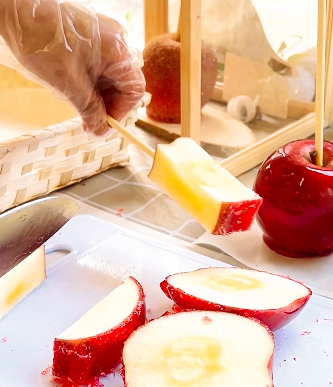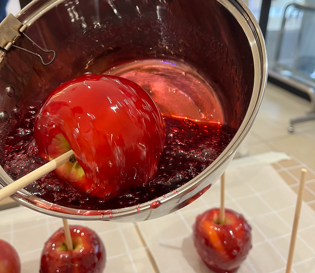 りんご飴の表面がぷつぷつしているのを見つけたことはありますか?このぷつぷつは、実は美味しさの証拠なんです。新鮮なりんごを使用することで、果汁が熱されて、そのガスが気泡としてりんご飴の表面に現れます。ぜひよく観察してみてください!